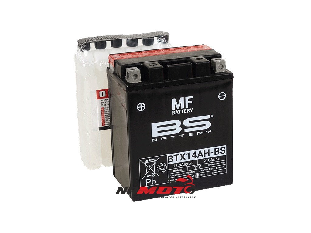 Baterie BTX14AH-BS je součástí naší bezúdržbové MF řady. Tato 12V 12.6Ah baterie se dodává s balením elektrolytu (kyseliny) a před prvním použitím je nutné ji aktivovat nalitím kyseliny.