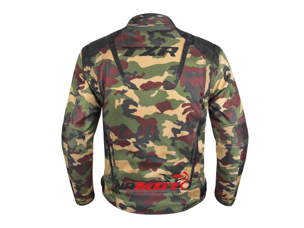 Moto bunda TXR Gunner Camo zelená vyrobená z oderu odolného materiálu Polyester Textoch 600 D v kombinácii s ISO bezpečnostnými švami a predným YKK zipsom. Dodávame vrátane termo podšívky, ktorú je možné ľahko vybrať pomocou zipsu. Vašu viditeľnosť v prevádzke zaisťujú reflexné prvky 3M Scotchlite na rukávoch av zadnej časti bundy. Oblasť krku je podšitá príjemným neoprénom pre vyššie pohodlie, navyše si golier môžete nastaviť pomocou suchého zipsu. Medzi ďalšie nastaviteľné prvky tejto motorkárskej bundy patria cvoky na rukávoch, suché zipsy na manžetách rukávov a bokoch. Prvky dopĺňajú aj flexibilné panely na bokoch a lopatkách, vďaka ktorým si bundu ľahko napasujete presne na vašu postavu.