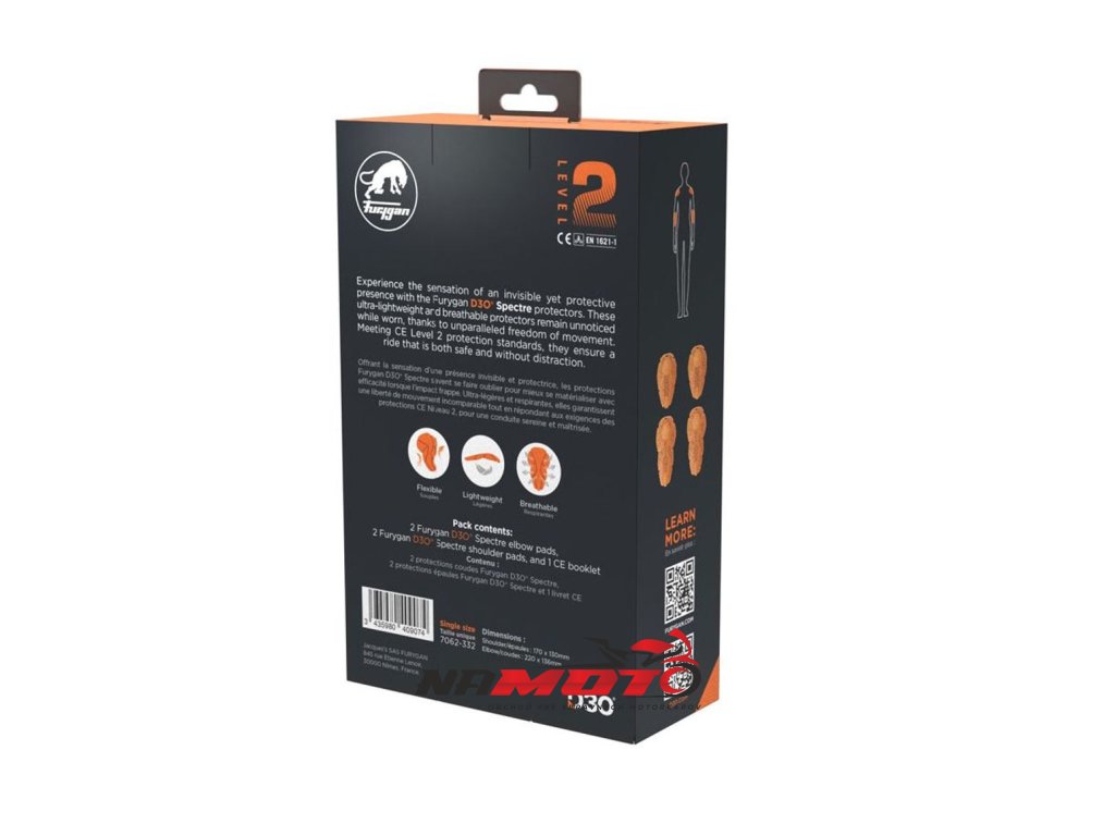 Chrániče Furigan Spectre D3O® L2 sú najnovším pokrokom v ochrannej technológii, vyvinuté exkluzívne spoločnosťami Furygan MotionLAB a D3O®. Sú navrhnuté tak, aby sa dali dodatočne namontovať na akúkoľvek bundu Furygan, a okamžite zvyšujú ochranu na úroveň 2. Každý chránič je predtvarovaný a vysoko flexibilný, čo zaisťuje výnimočné pohodlie, slobodu pohybu a bezpečné nosenie.