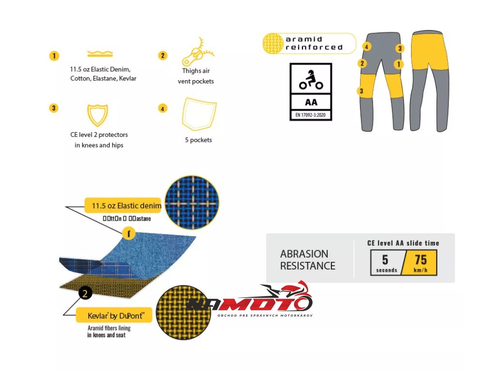 - pružný materiál v rozkroku zaisťuje dvojdimenznú elasticitu a zaručuje komfort pohybu pri jazde na motocykli