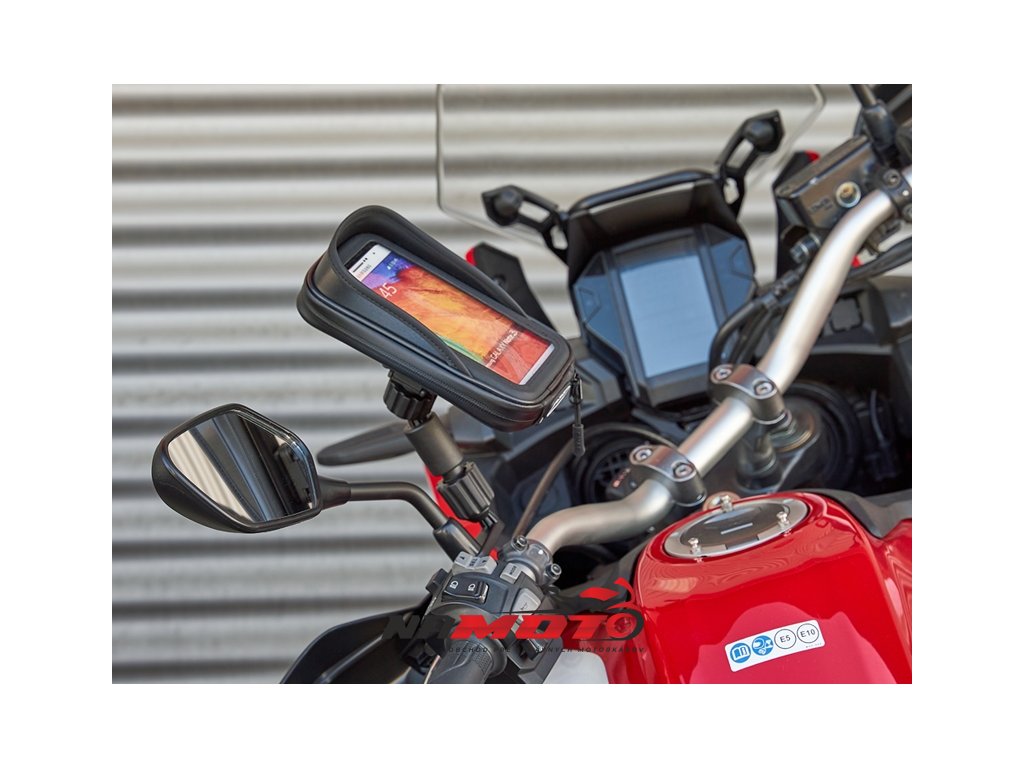 Držák smartphonu kompatibilní se všemi motocykly. Rychlá a snadná instalace na zrcadlo díky univerzálnímu montážnímu systému, nastavitelné i v rukavicích. Antireflexní průzor, zesílený vývod na kabel a vnitřní podložky pro různé velikosti telefonů. Bezpečnostní popruh součástí.