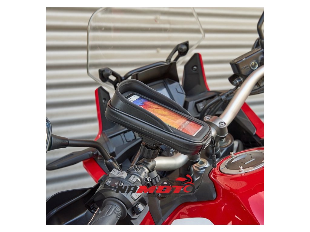 Držák smartphonu kompatibilní se všemi motocykly. Rychlá a snadná instalace na řídítka díky univerzálnímu montážnímu systému, nastavitelnému i v rukavicích. Antireflexní průzor, zesílený vývod kabelu a vnitřní podložky pro různé velikosti telefonů. Bezpečnostní popruh součástí. Kompatibilní také s jinými vozidly, jako jsou čtyřkolky, jízdní kola nebo skútry.