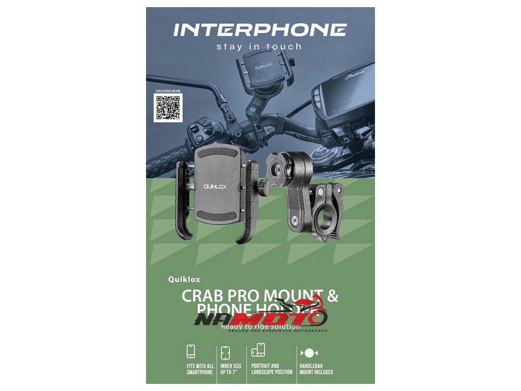Sada Quiklox Crab Pro obsahuje verziu s integrovaným držiakom Quiklox pre slávny Interphone Crab. Rýchle pripevnenie a odpojenie umožňuje manipuláciu s mobilným telefónom, aj keď je chránený krytom, a jednoduché používanie dotykovej obrazovky. Balenie už obsahuje držiak SMQUIKLOXHANDLEBAR. Je kompatibilný s rôznymi typmi držiakov a s novým modulom na redukciu vibrácií SMQUIKLOXANTIVIB pre dodatočnú ochranu.