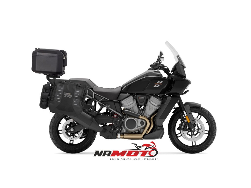 Kompletná sada sedlových brašní SHAD TERRA TR40 adventure a hliníkového vrchného kufra SHAD TERRA BLACK 48L vrátane montážnej sady SHAD Harley Davidson Pan America 1250