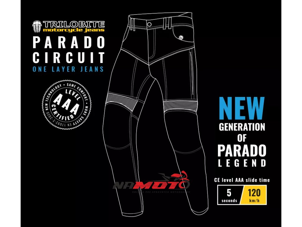 Ako vybrať správnu veľkosť nohavíc? Nová generácia najžiadanejších motocyklových riflí na trhu! Trilobite Parado Circuit sú jediné moto jeans z ponuky Trilobite®, ktoré sa môžu pochváliť certifikáciou označenou tromi "áčkami". Tá je najčastejšie vidieť na kožených racingových bundách alebo kombinézach. Tieto džínsy sú vyrobené z veľmi odolného materiálu TRI-FORCE®, ktorý sa vyrába spojením bavlneného vlákna s vláknom UHMWPE. Tento exkluzívny technologický proces vytvára pravý denim s pevným jadrom a vďaka tomu disponuje materiál TRI-FORCE® mechanickými vlastnosťami pravej kože. Vďaka nemu dosahujú nohavice Trilobite Parado Circuit extrémnu ochranu v jednej vrstve!