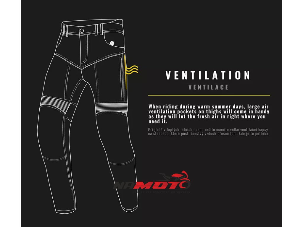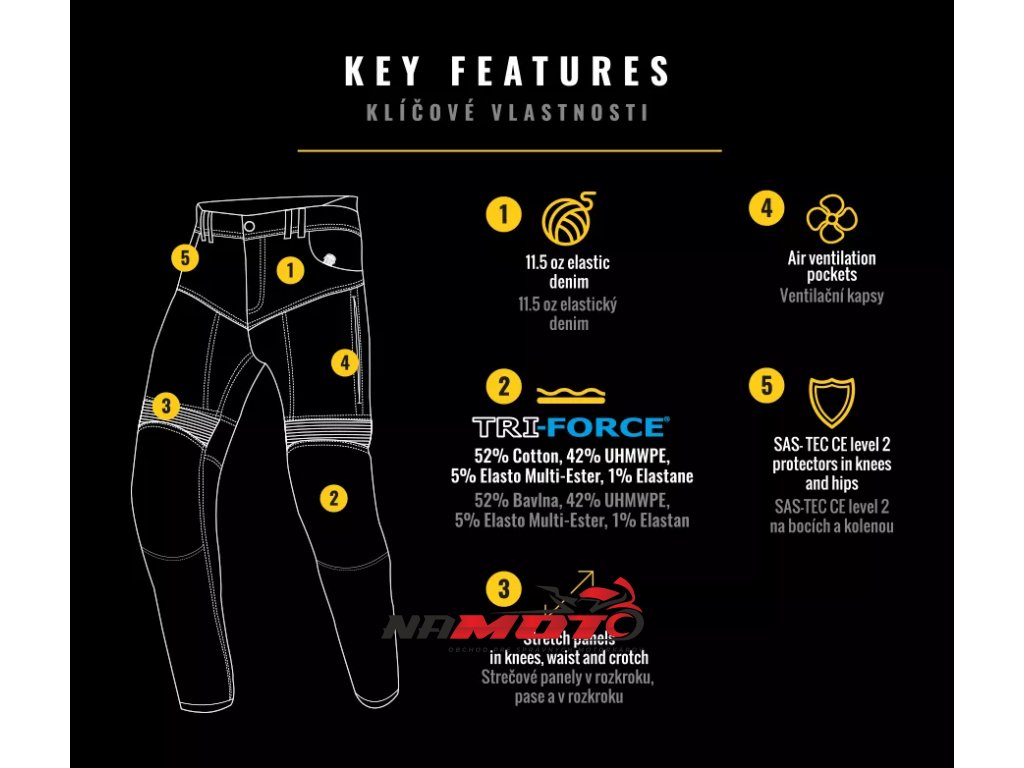 Džínsy ponúkajú bezkonkurenčný jazdný komfort nielen kvôli elastickému denimu, ale aj vďaka ergonomicky tvarovaným strečovým panelom v rozkroku, oblasti sedu a na kolenách. Súčasťou nohavíc sú vyberateľné chrániče SAS-TEC CE level 2, ktoré sú umiestnené na kolenách a bokoch. Zaručujú maximálnu ochranu pri prípadnom páde v týchto partiách tela. Pri jazde v horúcich letných dňoch určite oceníte veľké ventilačné vrecká na stehnách, ktoré pustia čerstvý vzduch presne tam, kde je to potrebné. VONKAJŠÍ MATERIÁL: - Davos Denim, TRI-FORCE® (52% bavlna, 42% UHMWPE, 5% Elasto Multi-Ester, 1% elastan), Stretch Fabric STRETCH panel - zvyšuje optimálne pohodlie a umožňuje dvojdimenznú elasticitu - zaručuje komfort pohybu pri jazde na motocykli - vyrobené z elastoméru v kombinácii s polyamidovými vláknami VENTILÁCIA - nevyhnutná ventilácia pre naozaj horúce letné dni - zvyšuje komfort a pohodlie pri jazde na motocykli.