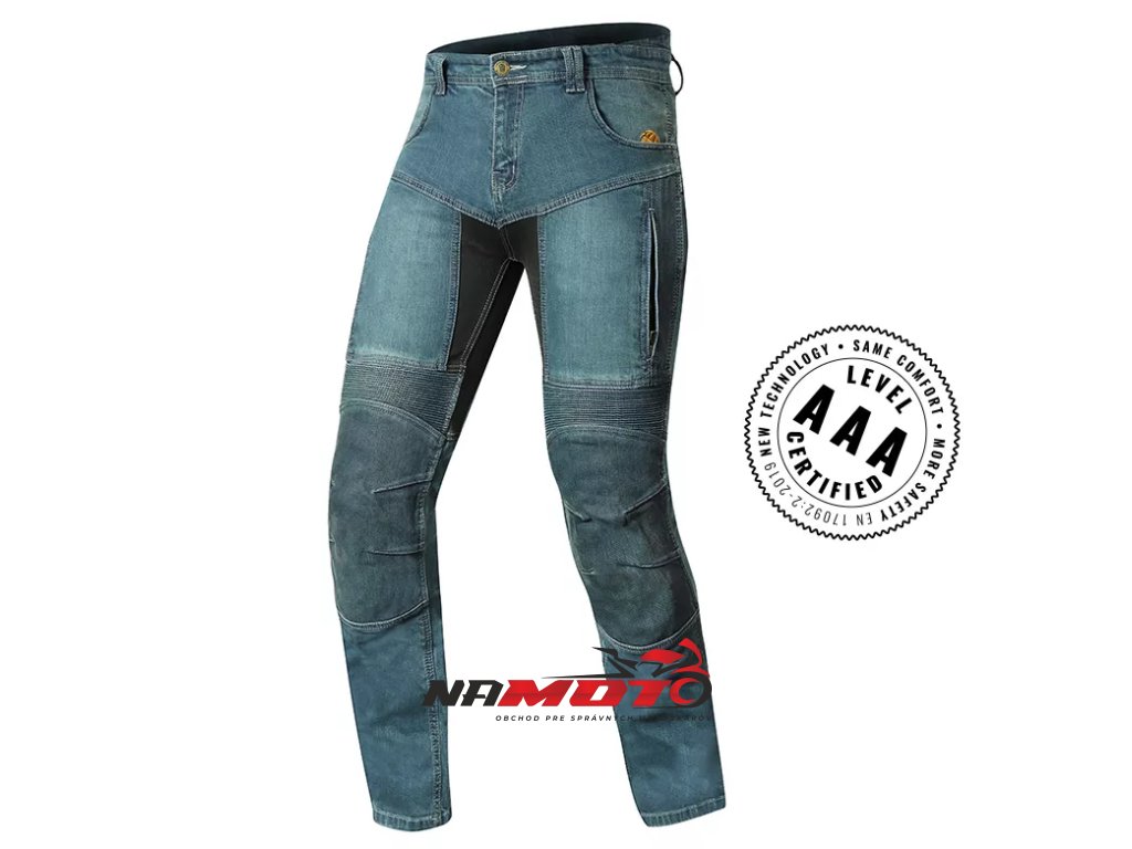 ERGONOMICKÉ VLASTNOSTI - 5 vreciek - strečové panely na kolenách, v páse a rozkroku - nastaviteľná výška chráničov kolien - dvojité pútka - zvýšený bedrový pás Čo je vlastne certifikácia označená AAA? Bezpečnosť pri jazde na motorke je dnes oveľa častejšie skloňovaná ako predtým. Preto je hlavným cieľom značky Trilobite® ponúkať kvalitné a bezpečné oblečenie pre motorkárov. Džínsy Trilobite® sú testované podľa najnovších noriem EÚ. Nová norma EÚ EN 17092: 2020 prináša nové skúšobné metódy, ktoré môžu oveľa lepšie simulovať skutočnú odolnosť výrobkov pri náraze či odere. Každá úroveň ochrany udáva dobu odolnosti proti oderu pri "kĺzaní" po asfalte. Existujú tri úrovne A - AAA. Podľa nich je možné rozdeliť oblečenia pre rôzne typy použitia v súlade s odolnosťou proti oderu. Pre najrizikovejšiu jazdu sú vyvíjané produkty s odolnosťou proti oderu dosahujúce úroveň AAA. Tú najčastejšie vidíme u kožených závodných kombinéz napríklad. Takto označené oblečenie môže poskytnúť tie najúčinnejšie ochranné prvky v prípade pádu. Oblečenie certifikované v úrovni AA je stále veľmi bezpečné! Ale s niektorými nižšími vlastnosťami oproti oblečeniu s certifikáciou AAA. Výrobky s úrovňou A sú vyvinuté na jazdu v nižších rýchlostiach a nižších rizikách.