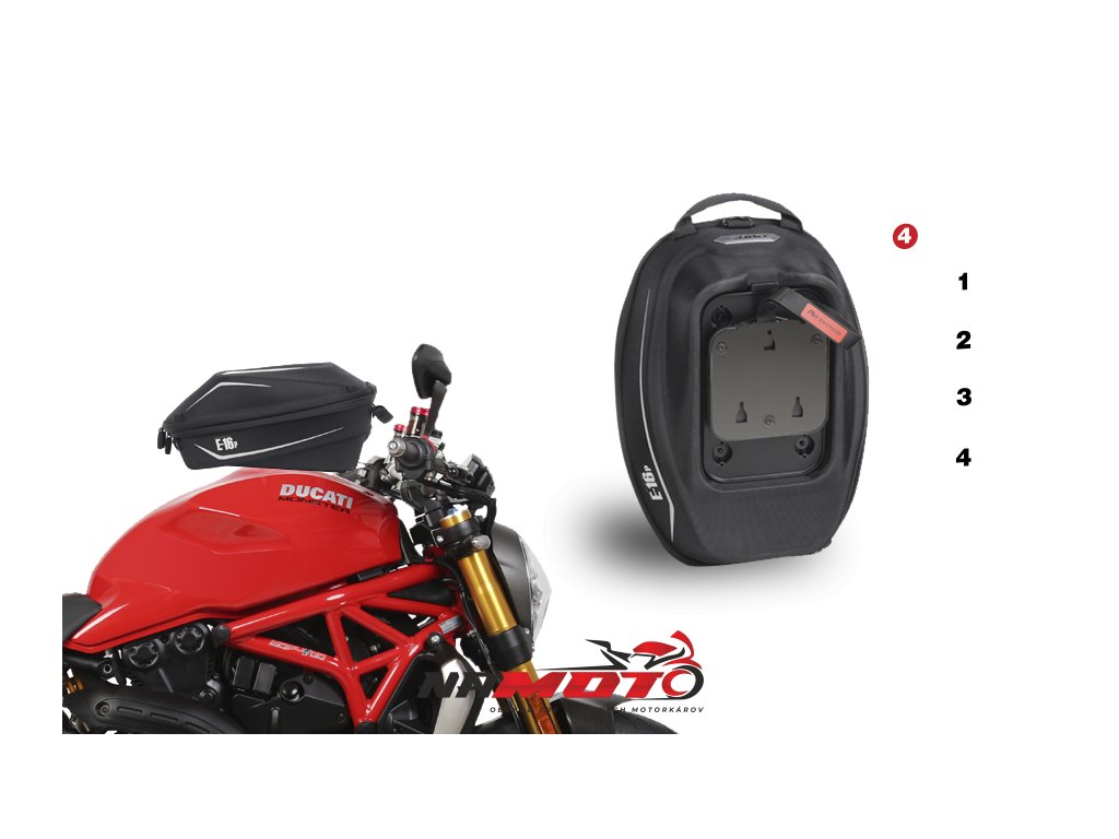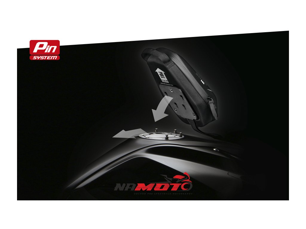 Inovativní PIN SYSTEM umožňuje bezpečně a snadno připevnit tašku k nádrži motorky. 3 nebo 4 z původních šroubů víčka nádrže jsou nahrazeny diskrétními „piny“, což činí celou montáž velmi jednoduchou a hotovou za pár minut. Kompatibilní s taškami E04P, E10P a E16P. Stačí si vybrat tu správnou montážní sadu pro váš model motorky.