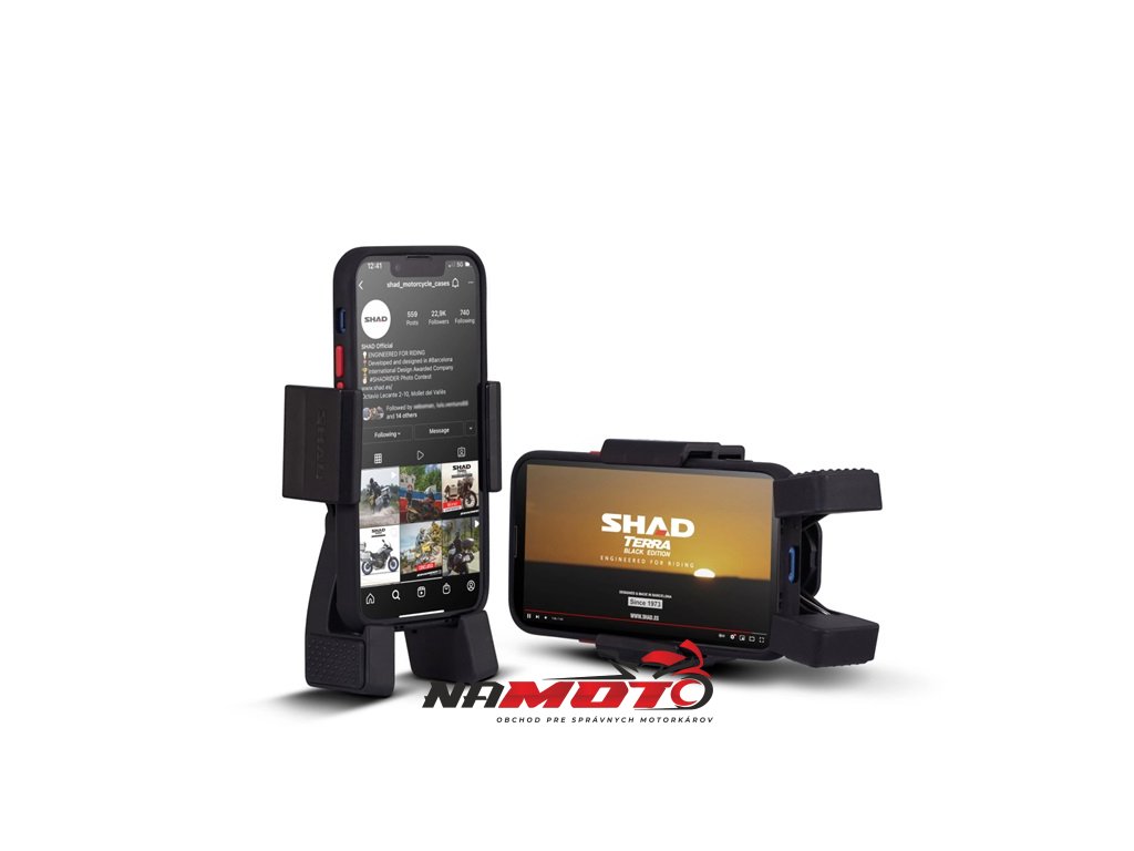 Nasazení či sejmutí držáku je velmi jednoduché díky univerzálnímu systému s mechanickou pojistkou SHAD Quick Click System, který umožňuje rychle nasadit a sejmout horní část držáku i s telefonem. Držák disponuje velkým ovládacími plochami, takže s ním lze manipulovat i s rukavicemi na rukou. Bezpečnost telefonu je zajištěna gumovými úchyty, které přístroj obejmou a zabraňují jeho vyklouznutí, dále bezpečnost telefonu zvyšuje i gumová pojistka, kterou můžete telefon pojistit proti vyklounutí. Bezpečnost telefonu dále zvyšuje popruh, kterým jej k řidítkům, takže i v případě, že jej .