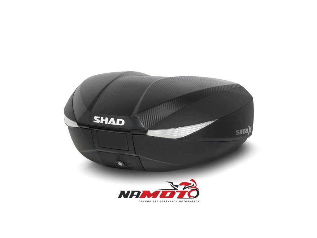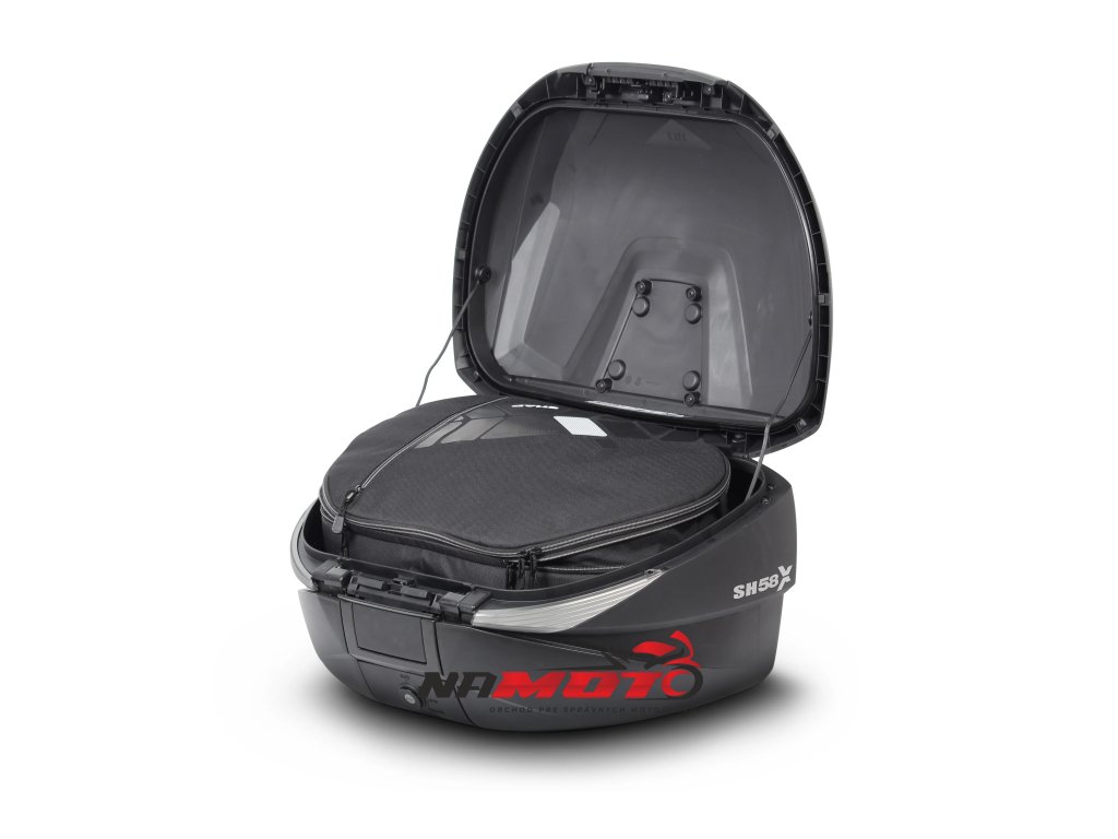 Vrchní kufr SH58X s karbonovou úpravou a s nastavitelným objemem ve 3 různých polohách (46, 52 a 58 litrů), má kapacitu pro uložení 2 XXL helem bez nutnosti položit je na bok, plus cestovní doplňky. Díky špičkové technologii a inovativnímu designu získal vrchní kufr SH58X prestižní cenu Reddot Design Award 2017, což je pojem mezi designéry a výrobci. Je to jediný vrchní kufr na trhu, který lze rozšířit až na kapacitu 58l a je tak vhodný jak na každodenní využití tak i na dobrodružné výlety, o kterých jste vždy snili. Je to vysoce všestranný vrchní kufr, který lze během několika sekund změnit z aerodynamického kufru na velký cestovní kufr. Jeho konstrukce zaručuje vysokou tuhost a odolnost při zachování minimální hmotnosti. Uvnitř má tento kufr přídržné popruhy, které zajišťují, že se vnitřní náklad za jízdy nepohybuje.