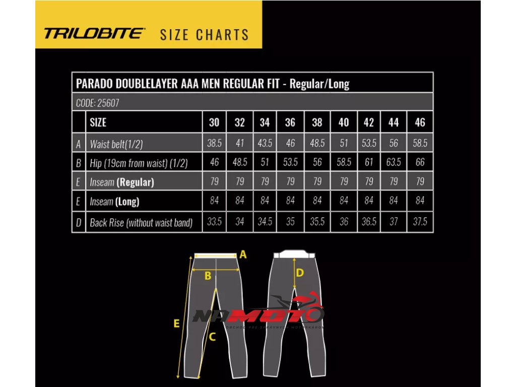 Ďalší člen rodiny Parado, ktorý teraz neobsahuje kevlarovú vrstvu. Parado Doublelayer AAA džínsy sú podšité novým materiálom Tri-Stretcher® PRO 5.0 Denim na strategických miestach – kolená, boky a zadok. Tento materiál sám v jednej vrstve spĺňa najprísnejšie certifikačné požiadavky triedy AAA. Týmto spojením vznikli džínsy, ktoré sú na vrchole bezpečnosti, čo sa týka oteruvzdornosti. - Vrchný materiál: elastický denim 11,5 oz, 98% bavlna, 2% elastan - Podšité Tri-Stretcher® PRO 5.0 Denim na strategických miestach - CE level 2 chrániče kolien a bokov súčasťou - Kolenné chrániče je možné posúvať do strán a na potrebnú výšku. - 2 predné, 2 zadné - zapínanie na 2 gombíky a zips - ventilačné vrecká na stehnách - priedušný streč v oblasti sedu - originálne YKK kovové zipsy na poklopci a na ventilačných vreckách - kovový gombík s logom Trilobite v páse - vpredu dvojité pútka na opasok - v bedrovej oblasti zvýšený pás pre maximálny komfort pri jazde - zvýšená zadná časť pása pre komfort pri jazde - CE Certifikované podľa EN 17092-2:2020, trieda AAA - dostupné v pánskom a dámskom strihu av niekoľkých farbách Vlastnosti materiálu Tri-Stretcher® PRO 5.0 Denim Základnou myšlienkou bolo vyvinúť tkaninu, ktorá bude vynikať pohodlím, bezpečnosťou a zároveň splní náročné požiadavky na strih, opotrebenie, roztrhnutie, oteruvzdornosť a chemickú odolnosť finálneho výrobku pri CE Certifikačných testoch. Tri-Stretcher® PRO 5.0 Denim je špeciálnou zmesou Aramidu, Nylonu, Polyesteru, bavlny a Elastanu patentovaná spoločnosťou Bikers Crown s.r.o., ktorá je výhradným vlastníkom a materiálom a zároveň dizajnérom motocyklových džínsov Trilobite. Vďaka nedávnym prelomom v oblasti syntetických vlákien môžu byť džínsy pre jazdu na motocykli ľahšie ako kedykoľvek predtým. Nová generácia syntetických a polyetylénových vlákien umožňuje zmiešať Polyester, Nylon, Elastan a ďalšie priadze, napríklad aj prírodné, do úplne novej, sofistikovanej tkaniny na výrobu motocyklových džínsov Trilobite. Tri-Stretcher® PRO 5.0 Denim je moderná technická tkanina, ktorá je budúcnosťou jazdy na motocykli. Vyrába sa zo zmesi materiálov z rodiny polyamidov ako je Nylon a aromatických polyamidov, ako je Aramid alebo polyuretánové vlákna vyrobené z Elastanu, a zároveň zahŕňa prírodnú bavlnenú tkaninu. Táto látka je jedinečná svojou úžasnou pevnosťou a zároveň nízkou hmotnosťou. Tri-Stretcher® PRO 5.0 Denim je jeden „šikovný tím“ rôznych vlákien spletených dohromady, ktoré vás v prípade nehody ochránia rovnakým spôsobom ako celokožená kombinéza, ale bez kompromisu na pohodlie.
