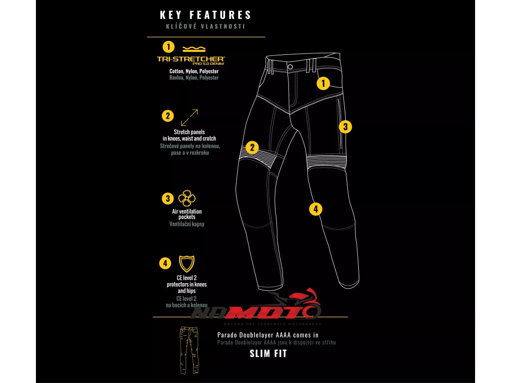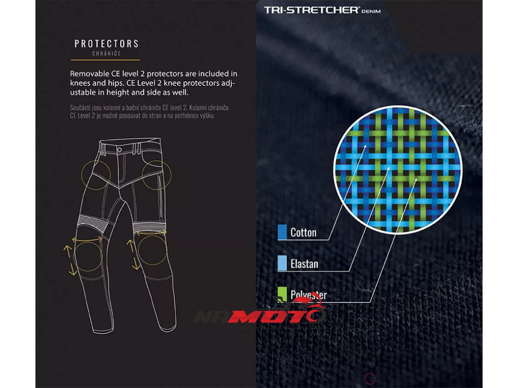 • TRI-STRETCHER® PRO 5.0 DENIM je špeciálnou zmesou Bavlny, Elastanu a Polyesteru.