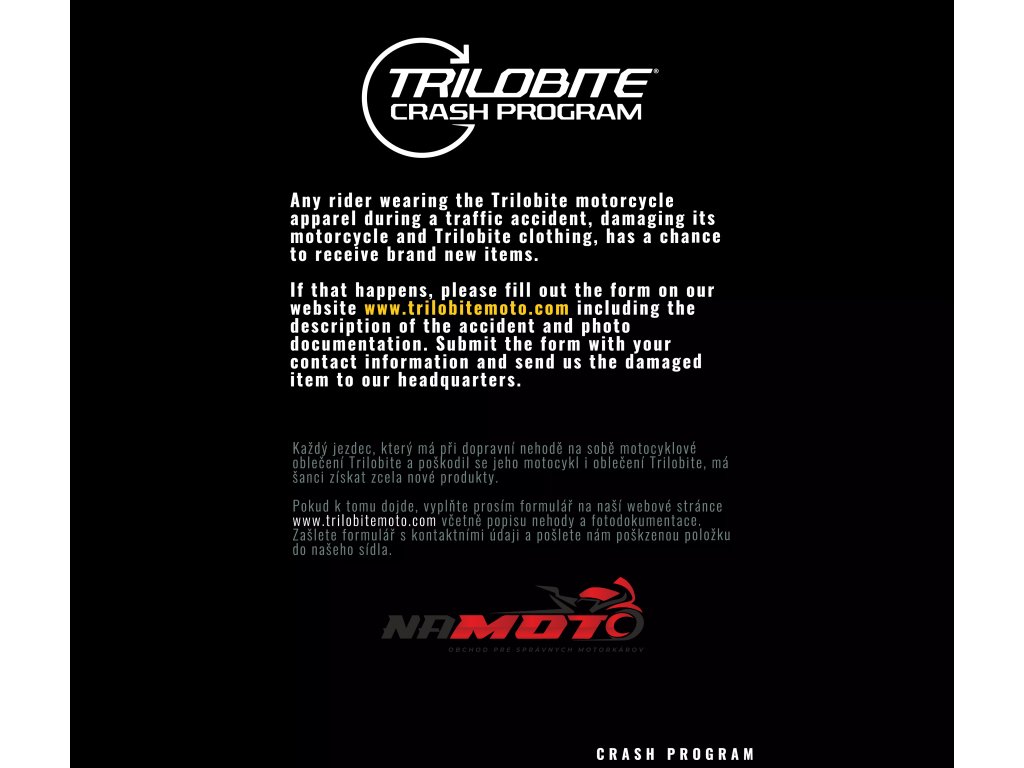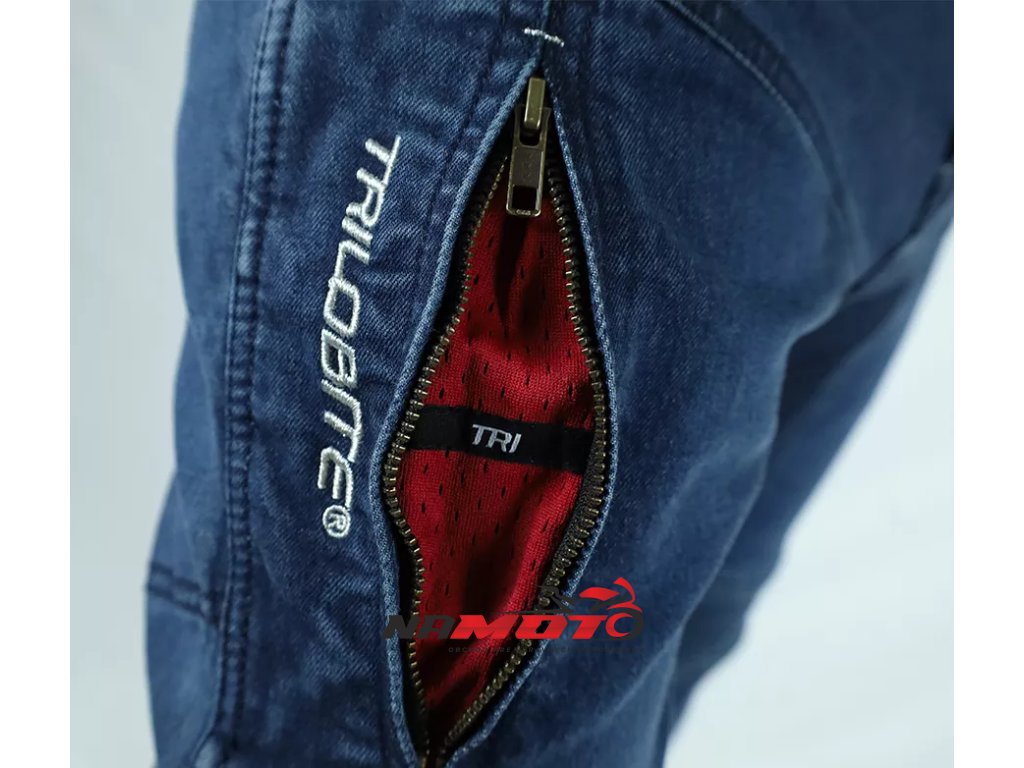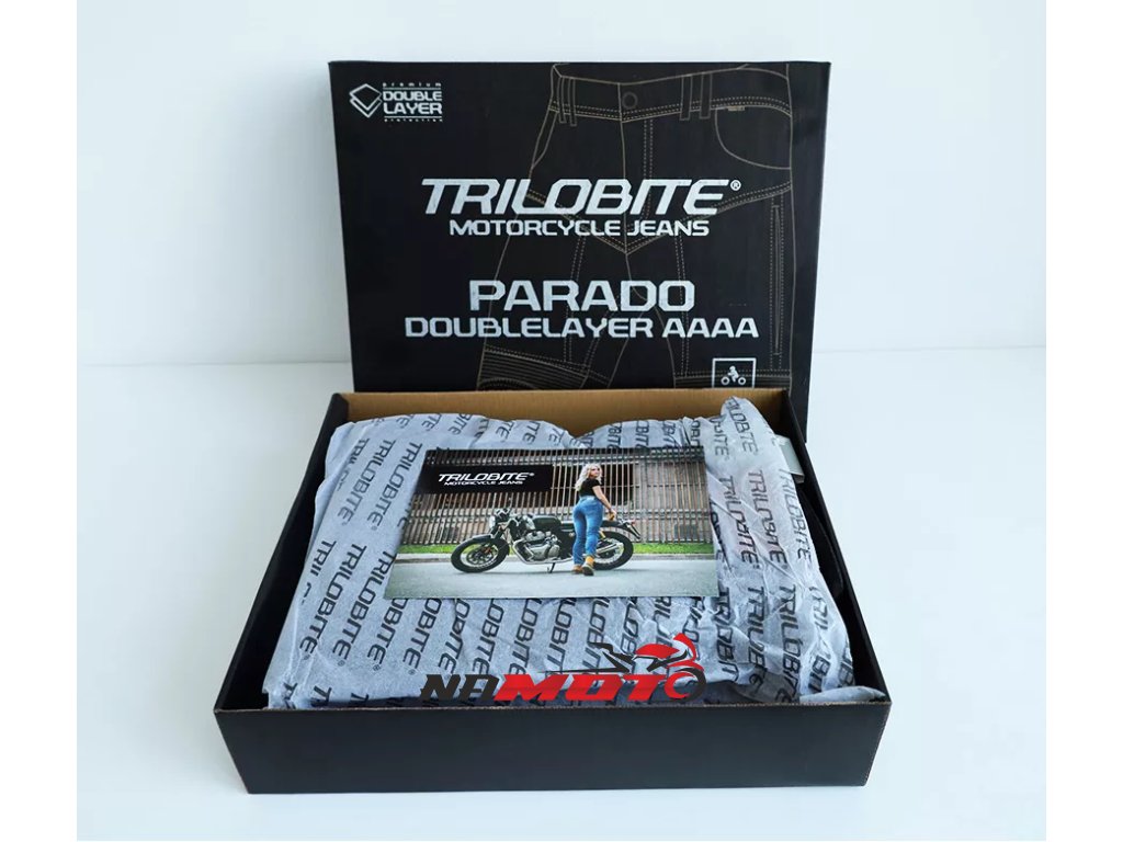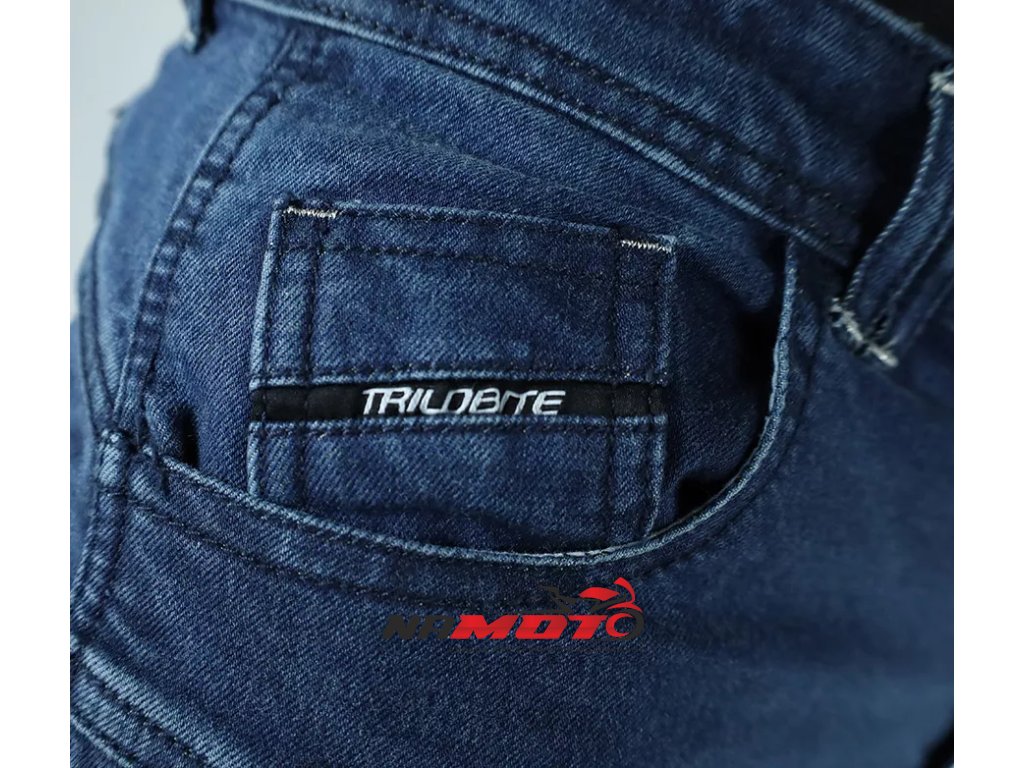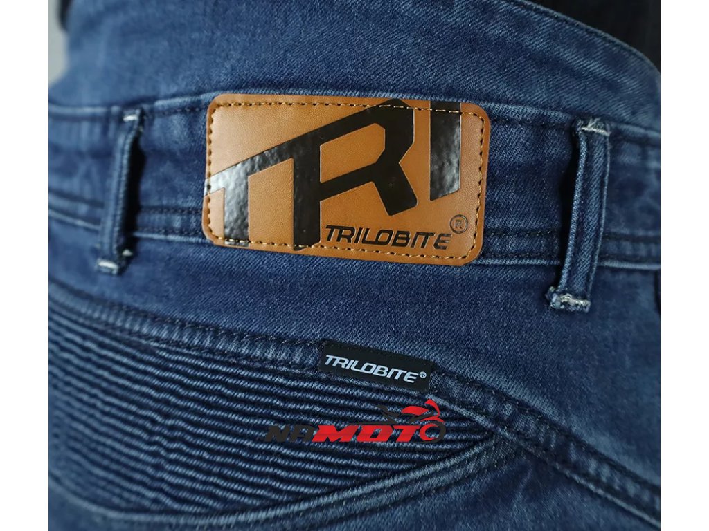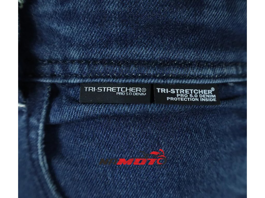 Vlastnosti materiálu Tri-Stretcher® PRO 5.0 Denim Základnou myšlienkou bolo vyvinúť tkaninu, ktorá bude vynikať pohodlím, bezpečnosťou a zároveň splní náročné požiadavky na strih, opotrebenie, roztrhnutie, oteruvzdornosť a chemickú odolnosť finálneho výrobku pri CE Certifikačných testoch. Tri-Stretcher® PRO 5.0 Denim je špeciálnou zmesou Bavlny, Elastanu a Polyesteru patentovaná spoločnosťou Bikers Crown s.r.o., ktorá je výhradným vlastníkom materiálu a zároveň dizajnérom motocyklových džínsov Trilobite. Vďaka nedávnym prelomom v oblasti syntetických vlákien môžu byť džínsy pre jazdu na motocykli ľahšie ako kedykoľvek predtým. Nová generácia syntetických a polyetylénových vlákien umožňuje zmiešať Polyester, Nylon, Elastan a ďalšie priadze, napríklad aj prírodné, do úplne novej, sofistikovanej tkaniny na výrobu motocyklových džínsov Trilobite. Tri-Stretcher® PRO 5.0 Denim je moderná technická tkanina, ktorá je budúcnosťou jazdy na motocykli. Vyrába sa zo zmesi materiálov z rodiny polyamidov ako je Nylon a aromatických polyamidov, ako je Aramid alebo polyuretánové vlákna vyrobené z Elastanu, a zároveň zahŕňa prírodnú bavlnenú tkaninu. Táto látka je jedinečná svojou úžasnou pevnosťou a zároveň nízkou hmotnosťou. Tri-Stretcher® PRO 5.0 Denim je jeden „šikovný tím“ rôznych vlákien spletených dohromady, ktoré vás v prípade nehody ochránia rovnakým spôsobom ako celokožená kombinéza, ale bez kompromisu na pohodlie. Tieto džínsy sú vyrobené z dvoch vrstiev najodolnejšieho materiálu Tri-Stretcher 5.0 Denim. Jedna vrstva tohto materiálu spĺňa CE certifikačné požiadavky levelu AAA. Preto spojením dvoch vrstiev tejto látky vznikli zatiaľ najbezpečnejšie džínsy na svete.