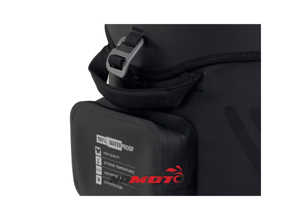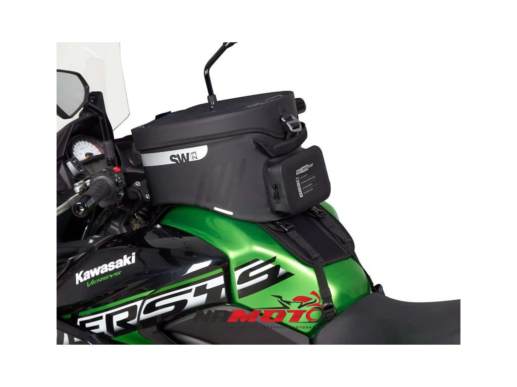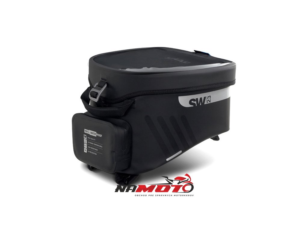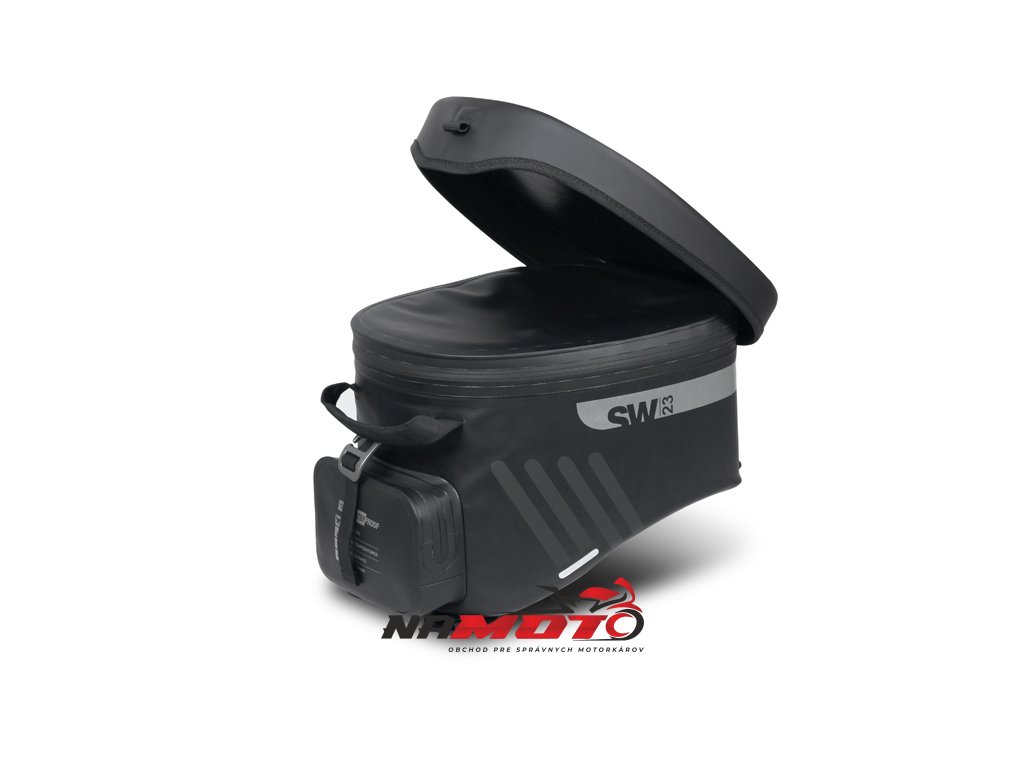 Vodotěsný vak na nádrž SW23B o objemu 14 litrů s univerzálním popruhovým systémem pro instalaci na plastové nebo kovové nádrže. Volitelný 4-bodový magnetický systém pro kovové nádrže (Ref. X1SL11). Klopě, která zcela zakrývá voděodolné zipy, je hlavní komora plně vodotěsná a ochrání všechny cennosti.