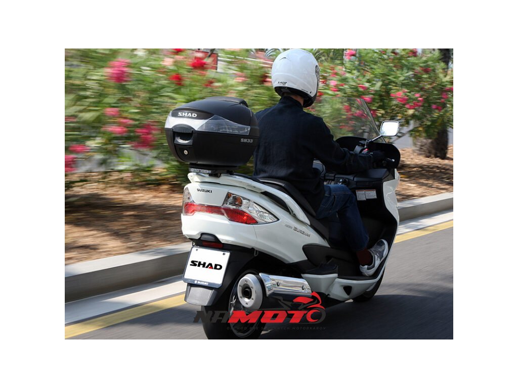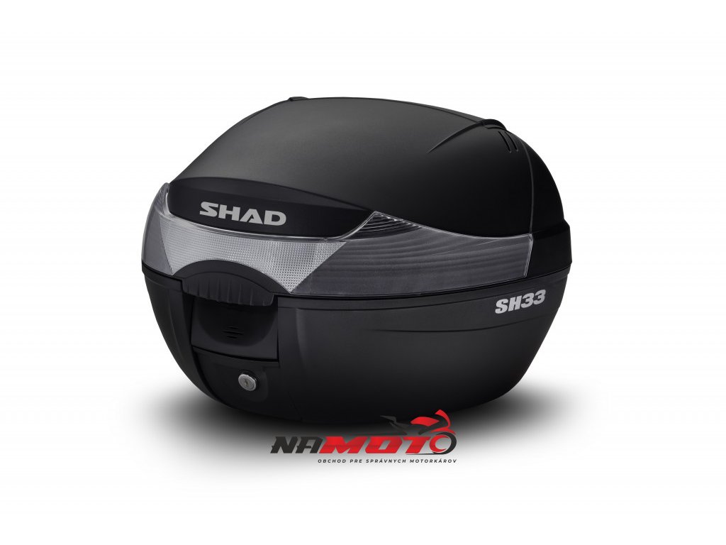 Vrchní kufr SH33 je kompaktní a velmi praktický vrchní kufr vyrobený z vysoce kvalitního tvrzeného polypropylenu, schopný pojmout vyklápěcí helmu a rukavice. Jedná se o základní model řady vrchních kufrů SHAD se zaobleným tvarem a kouřovou odrazkou. Svou velikostí je vhodný pro skútry a menší motorky s nižším objemem.